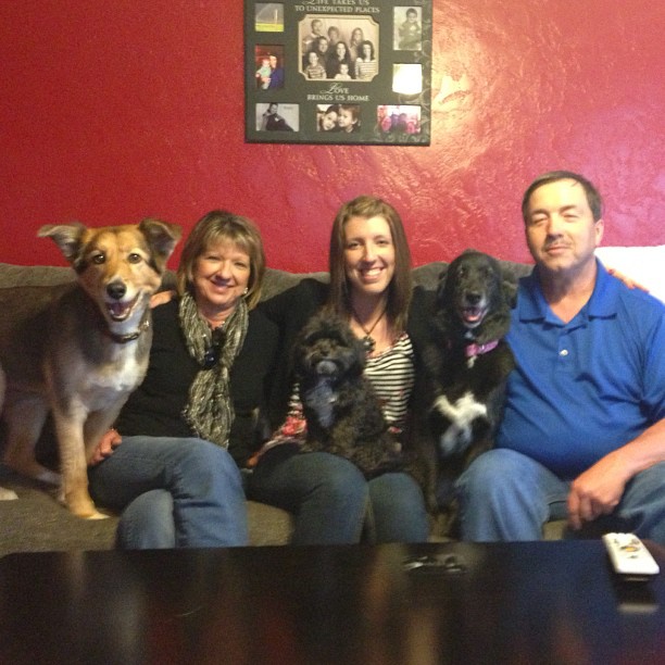My parents with my dog on the left, my grandma's dog in the middle, and my parents dog on the right! Can you believe they all looked at the camera at the same time?!?